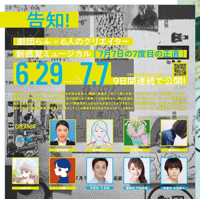 今回の作品について、らふは、「誰もが今年、大切な人と会えない時間を経験しました。しかしその時間が、大切な人を想うきっかけになったこともまた事実です。きっと七夕の織姫と彦星も、何千年という時間を同じような気持ちで過ごしていたのではないでしょうか。こういった経験をみんなで経験した今だからこそ、“誰かを想う、会える喜び”の象徴として、より共感してもらえる七夕の物語が描けるのではないかと思い、ミュージカル『7月7日の7度目の正直』を制作いたしました」と述べている。