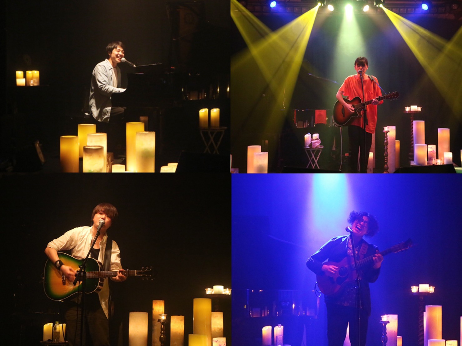 この日のラストを飾った井上緑は、初夏の季節にぴったりの軽快なイントロで始まる「サボテンの育て方」で爽やかに幕が開けた。キャンドルの光から覗く柔らかな姿とは対照的に、スッと一本筋の通った凛とした歌声が画面からも伝わってくる。ステージに立つのは久しぶりという彼だが、目の前に観客はいなくとも、「あなたに届けるように、届くように、歌います」と、そのスタンスを変えることなく画面の向こうに語り掛けるように歌い進めていく。女の子の揺れる気持ちを歌った「アイコトバ」、等身大の言葉で葛藤や不安をつづった「以上です。」、まるで隣にいる友達に話すように、そっと背中を押してくれる「大丈夫」、立ち止まってしまった時に切なくも優しく寄り添う「前夜」など、彼の歌は日常に起こるふとした瞬間の景色や感情がぎゅっと濃縮されている。圧倒的なヴォーカル・スキルと表現力は、画面からもしっかりと伝わったに違いない。
