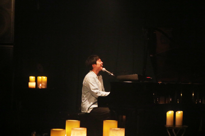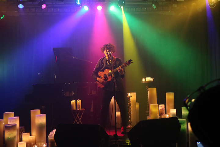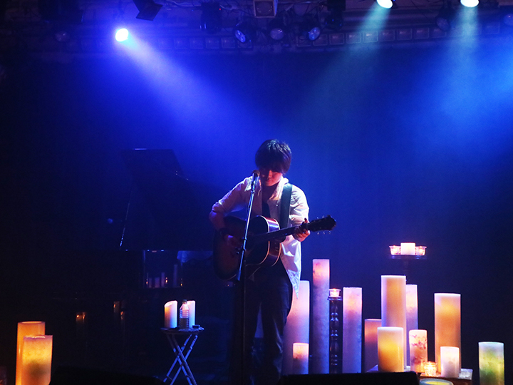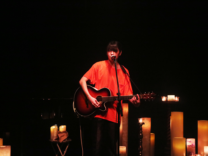 配信スタートとともに映し出された、暗闇のなかで揺らめくあたたかいキャンドルの姿は、ライブハウスからの配信であることを忘れるほどに幻想的だった。柔らかなピアノのイントロからはじまるバラード「あい」で、今回のライブの持つ世界へと一気に引き込んでくれたトップバッターの梅田淳平は、説得力のあるストレートな歌声と、奇をてらわないポップスで、エヴァ―・グリーンな魅力を放つシンガー・ソングライターだ。キーボードに切り替え、優しい音色とともに歌い上げた雨の曲「思い出のペトリコール」や、ブルーに染まった舞台の上でオレンジのキャンドルがきらめく様子も美しい「moon」など、今回は7曲という大ボリュームのステージ。「実はウェールズにホームステイをしていたことがあり、(今回のイベントに)縁を感じている」と話す姿も、そのあたたかな人柄が伝わってくる場面だった。
