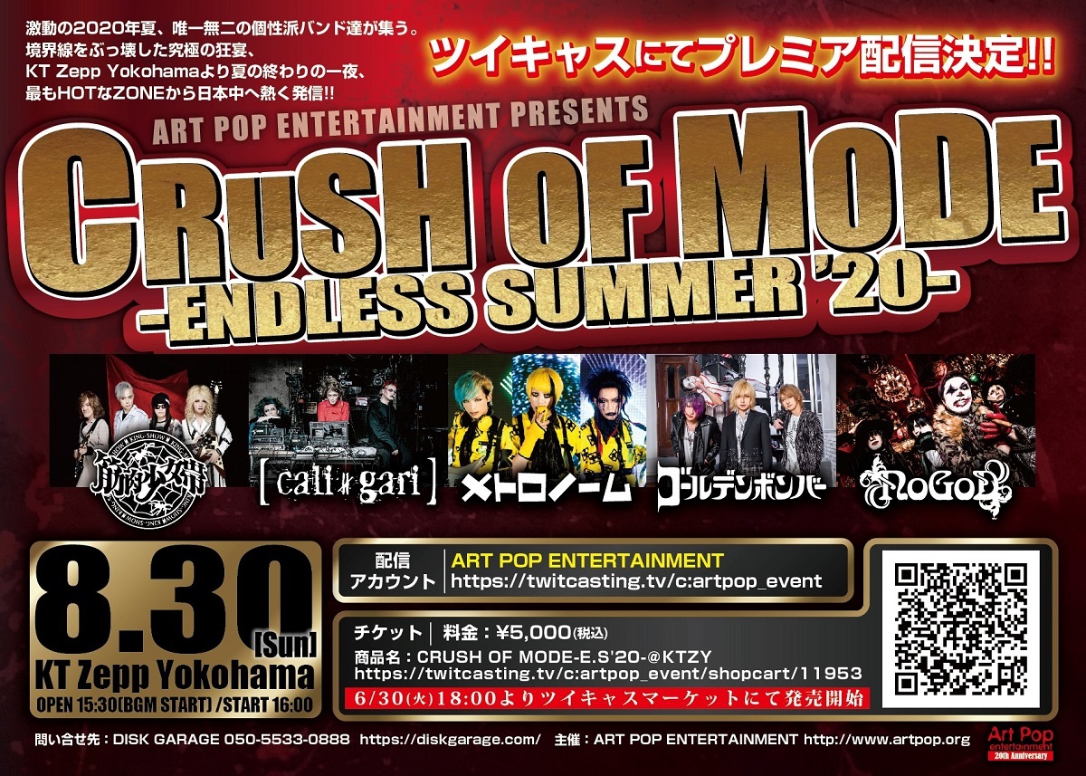 筋肉少女帯、cali≠gari、メトロノーム、ゴールデンボンバー、NoGoDが出演するライブイベント『CRUSH OF MODE -ENDLESS SUMMER’20-』が、無観客の有料ライブ配信で開催されることが発表となった。