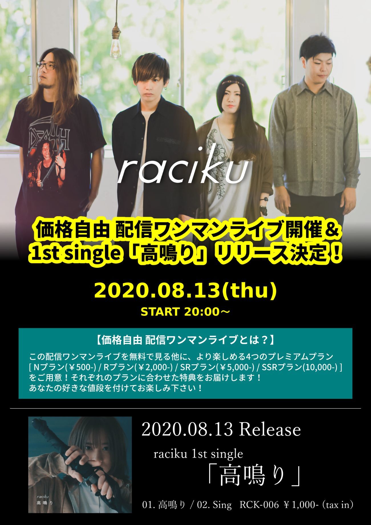 なお、racikuは8月13日(木)のシングルリリースにあわせ、『価格自由 配信ワンマンライブ』をYouTubeにて実施予定。詳細は、配信ページまたはraciku公式サイトを確認しよう。