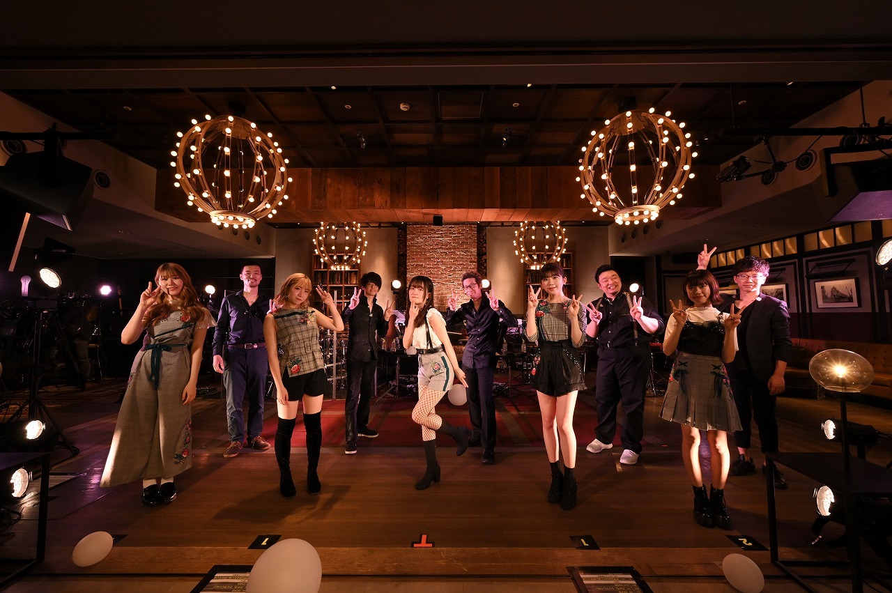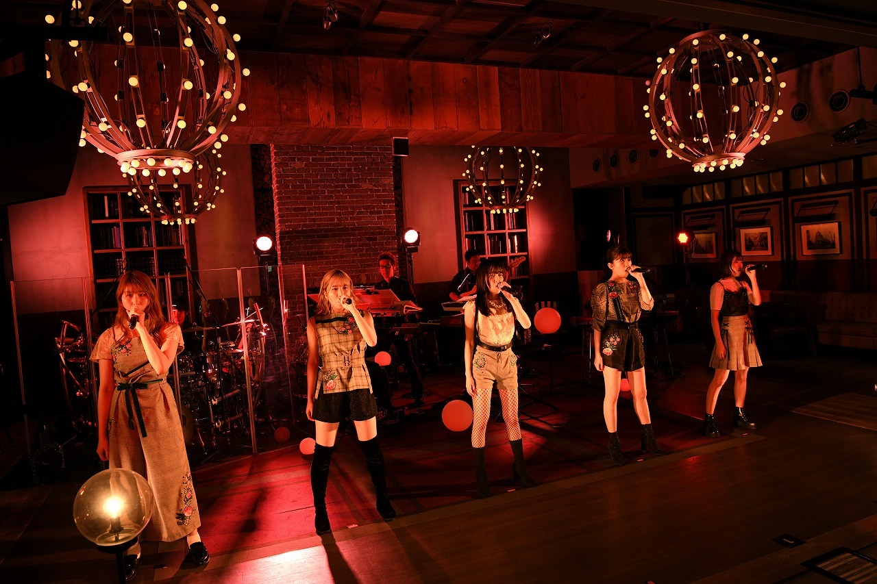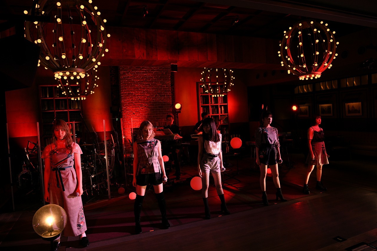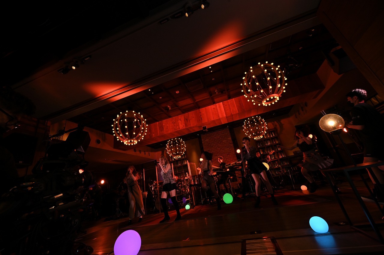 ツアーのリハーサル風景を中心に、モノクロームで仕上げたかっこいいタイトルトラックのオープニング。一転してシーンは現在へ、ドラマチックなピアノのタッチから始まる1曲目は、2月リリースの最新アルバム『BRIGHT NEW WORLD』から「In Your Calling」だ。メンバー5人とバックバンドが立つステージは、こぢんまりとしたプライベートスタジオのような空間で、壁の本棚やモノクロームの写真パネルなどが落ち着いた空気を醸し出す。芹奈、manaka、MAYU、アサヒ、かれんとマイクを繋ぐ、第一声から歌もハーモニーもばっちり決まってるが、ちょっと表情が硬いのはやはり初挑戦の緊張か。2曲目も最新アルバムからの「Classic」で、5人のスキャット風コーラスから始まるリズミックな曲を、バンドが熱いグルーヴでしっかりサポート。歌いながら芹奈が笑顔を見せ、アサヒが元気よくステップを踏む。調子が出てきたみたいだ。