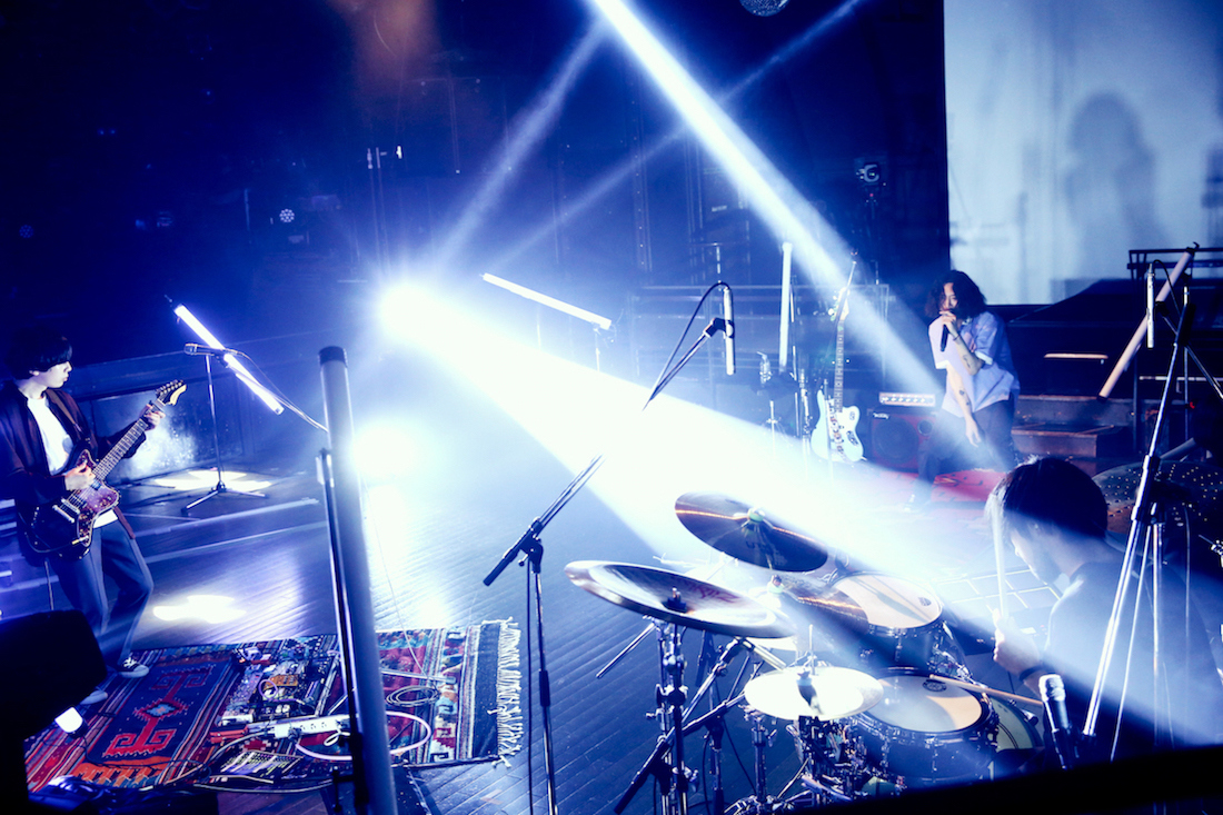 スリリングな曲は続く。「きっとこの命に意味は無かった」では、秋好のスモールクローンを活かしたギターと佐藤のリズムキープしつつも、アクセントたっぷりのドラムがオルタナな雰囲気を広げていく。メンバーの外側に配された大きな各色の蛍光灯が同曲の有した不穏さを更に増していく。