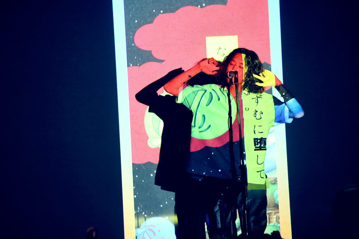 ここで初めてステージにキタニが上がる。スクリーンをバックに自身をも通し映される各MVの中、「トリガーハッピー」ではロック的ダイナミズムと雄々しい呼応性と共に広がり、「Sad Girl」では、歌われる疎外感や空白感、満たされない感じがどこか「そんな奴らここに集え」と歌われているようにことさら響いた。