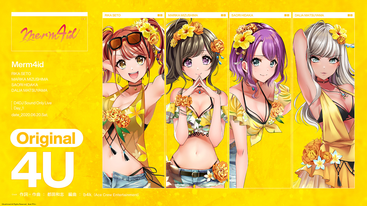 瀬戸リカ(CV.平嶋夏海)の出雲へのアンサーMCと共にMerm4idがステージに登場。イエローとブラックのセクシーなコーディネートにハイビスカスの花飾りと、女子大生ならではのパッションあふれる艶姿とMCで、彼女達はステージの空気を自分色に塗り替えていく。