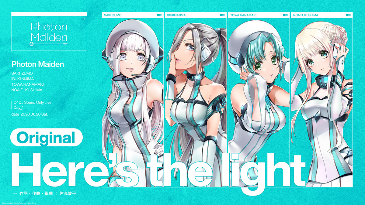 出雲咲姫(CV.紡木吏佐)のメッセージと共にオリジナルナンバー「Here’s the light」からPhoton Maidenのステージがスタート。新島衣舞紀(CV.前島亜美)、花巻乙和(CV.岩田陽葵)、福島ノア(ュCV.佐藤日向)も加わった四人の澄んだ歌声のハーモニーと、軽快なテンポのEDMが融合したこのナンバーは、聴いているだけで華麗なダンスパフォーマンスを見せる四人の姿が浮かぶようたった。そんなメロディが一気に加速しながら次のカバー曲「シドニア」「READY STEADY GO」へとノンストップで繋がっていく。特に「READY STEADY GO」は激しいロックだった原曲にPhoton Maidenらしい可愛らしくダンサブルなアレンジが施され、聴いているファン達のテンションも一気に加速していく。