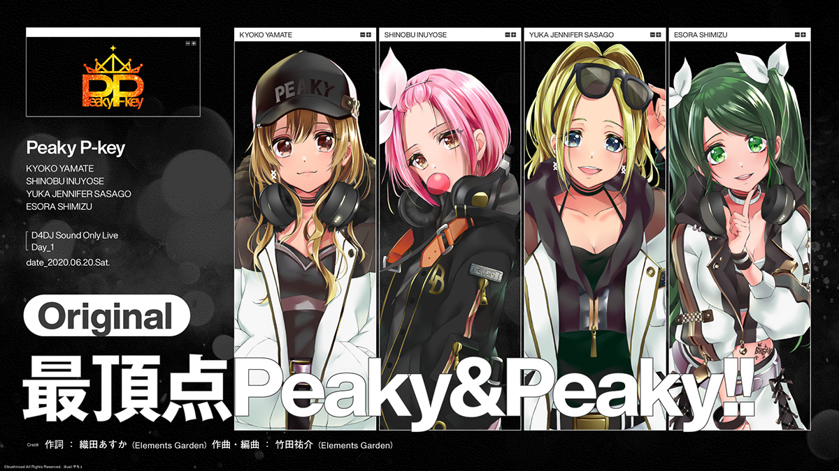 山手響子(CV.愛美)のMCと共にステージに現れたのは、『D4DJ』の物語の中心となる陽葉学園でトップクラスの人気を誇るDJユニット「Peaky P-key」。犬寄しのぶ(CV.高木美佑)、笹子・ジェニファー・由香(CV.小泉萌香)、清水絵空(CV.倉知玲鳳)ら、それぞれに秀でた才能と実力を秘めた四人で放つオープニングナンバーは、セカンドアルバム収録の最新オリジナル曲「Gonna be right」。自分の目指す未来のために全力で走りたいという思いを、力強く歌いきり、そのまま新カバー曲の「アンチクロックワイズ」へ。原曲のエッセンスはそのままに、激しいビートと四人のボーカルでよりパワフルなカバーでPeaky P-keyの持ち味である力強さを叩きつけていく。