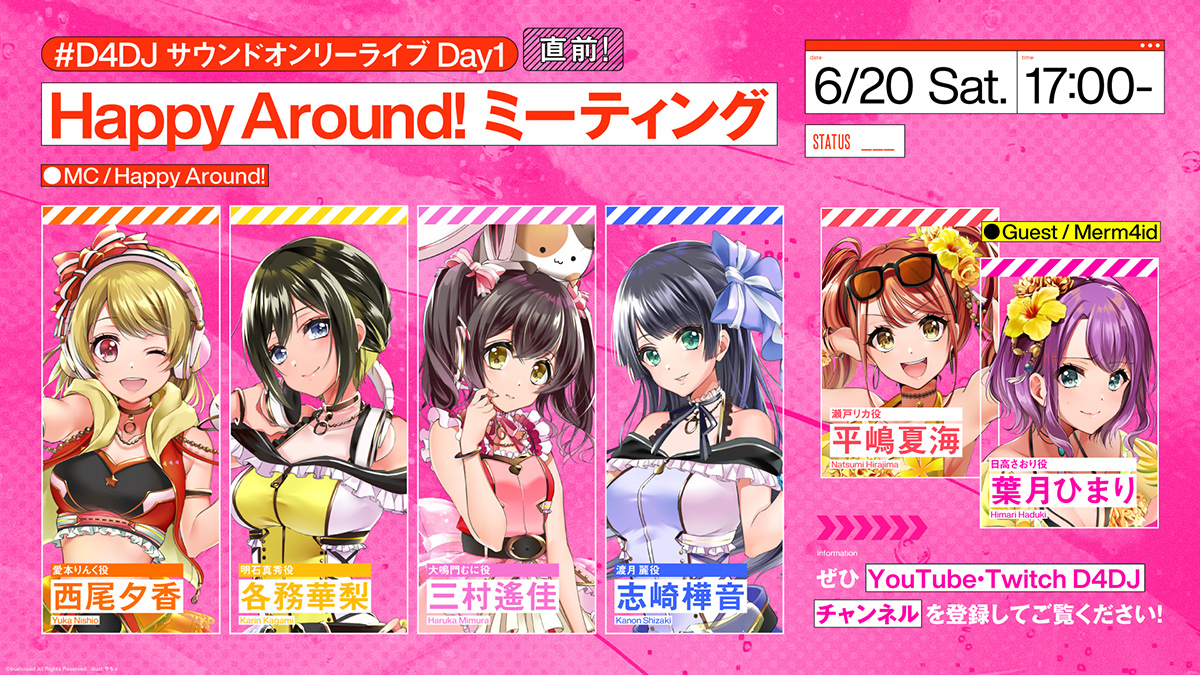18時からのライブに先立ってスタートしたのが、Happy Around!(愛本りんく役:西尾夕香、明石真秀役:各務華梨、大鳴門むに役:三村遙佳、渡月 麗役:志崎樺音)の四人とMerm4id(マーメイド)の瀬戸リカ役:平嶋夏海&日高さおり役:葉月ひまりによる生配信番組「#D4DJサウンドオンリーライブDay1直前!Happy Around!ミーティング」。新型コロナの影響で、キャスト陣の姿をライブ会場などで見る事のできないファンにとっては、六人の元気な姿は最高のプレゼント。偶然にも白ベースの服装で揃ったというHappy Around!にコメント欄では歓喜の言葉が飛び交った。