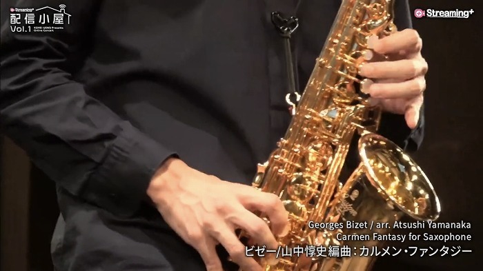 続くリムスキー=コルサコフの『熊蜂の飛行』で、雰囲気はがらりと変わった。熊蜂の羽音のような鈍いサクソフォンソロに始まり、ジャズ調の華やいだ粋なリズム、矢継ぎ早に繰り出される躍動感がみなぎる超絶奏法。最後にはスケールの大きな展開をみせた。まさに、上野の演奏の醍醐味を知る一曲となった。即興のようでありながら、緻密に楽譜に書き込まれた音の数々を、息をのむような演奏でさらりと吹きこなす。場の温度は一気に高まり、オンライン・コンサートでありながらも一体感が生まれた。