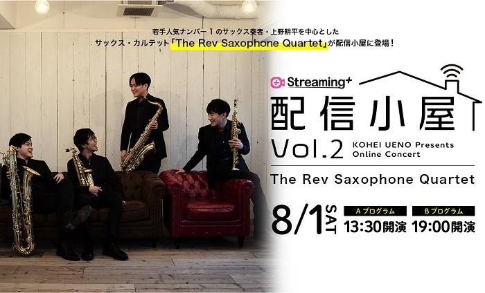 サックス奏者の上野耕平がプロデュースするオンライン・コンサート『配信小屋』シリーズ第二弾が、2020年8月1日(土)に開催され、サックス・カルテットのThe Rev Saxophone Quartet(ザ・レヴ・サクソフォン・クヮルテット)が出演することが決定した。