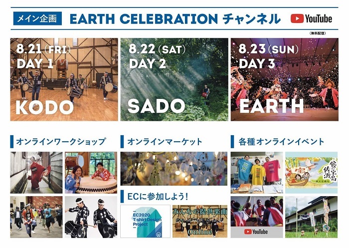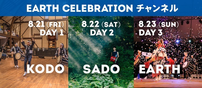 「KODO(鼓童)」、「SADO(佐渡)」、「EARTH(地球)」と3日間テーマを分け、1日7時間、鼓童メンバーによる趣向を凝らした配信やEC初公開の映像などぎっしり詰まった特別番組。