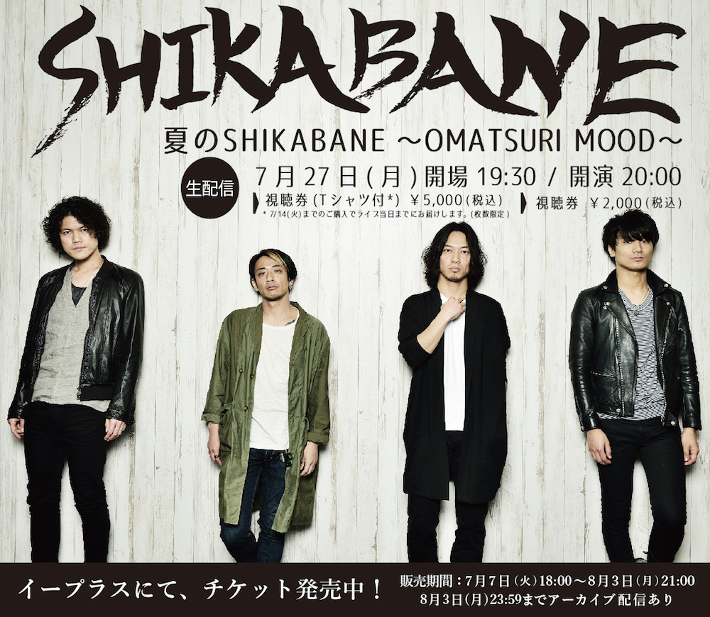 また、本日よりチケットの販売が開始しており、通常の視聴チケットに加え、SHIKABANE Tシャツ付きチケットも発売されている。Tシャツが7月27日の配信当日までに届くチケットは枚数限定になっているとのこと。