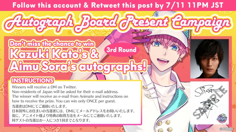 期間中に「アイムソラ」公式Twitterをフロー&RTした方の中から毎週抽選で1名様に、加藤和樹とアイムソラの【連名サイン色紙】が当たるRTキャンペーンを開催中。