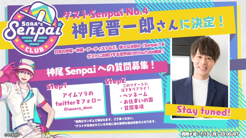 さらに、第4弾ゲストSenpai(先輩)に神尾晋一郎が決定。「アイムソラ」の公式twitterでは、番組第2回放送の「Notice Me Senpai Gacha」企画にて、神尾Senpai(先輩)への質問を募集している。是非この機会に質問を送って、神尾Senpai(先輩)にNotice(気づいて)もらおう。質問は、7月13日(月)23時までの受け付けとなっている。