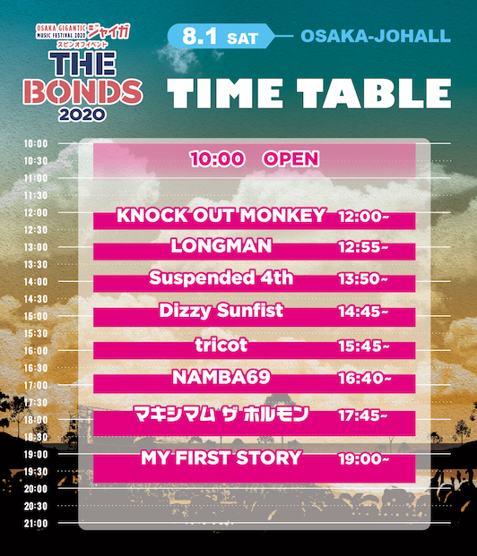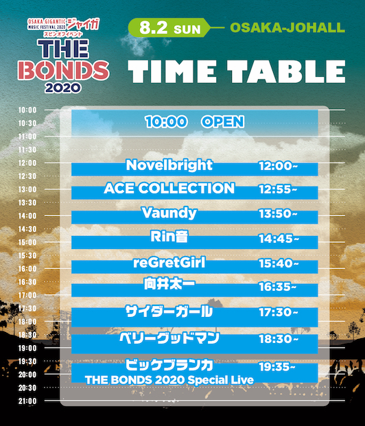 8月1日(土)、 8月2日(日)の2日間、大阪城ホールにて開催される音楽イベント『THE BONDS 2020』のタイムテーブルが発表された。