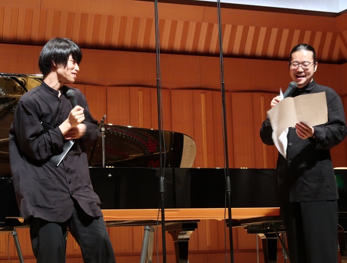 曲間のトークも楽しい。二人は作品や演奏についてのコメントのほか、衣装についても言及。この日のために「憧れのヨウジヤマモト」を一緒に揃えたという。「靴下も色違い」と仲の良さもアピール。黒のセットアップはスタイリッシュながら、どこかゆったりとした雰囲気も漂わせ、二人の雰囲気によく合っていた。