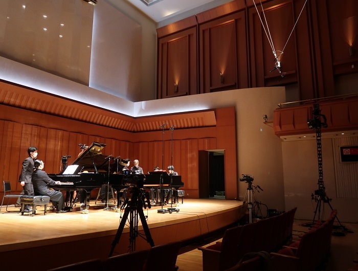 今回は、浜離宮朝日ホールからオンライン生中継を行うと同時に、会場には限定30席の観客席も設けられた。552席あるホールの中央およびバルコニーのブロックで、各座席の間隔を置きながら鑑賞できるチケットが発売され、入場時には一人ひとりの検温と、手指の消毒を済ませてからホール内に入るというウィルス感染予防対策が取られた。筆者も関係者席から久々に生演奏を聴くことができた。