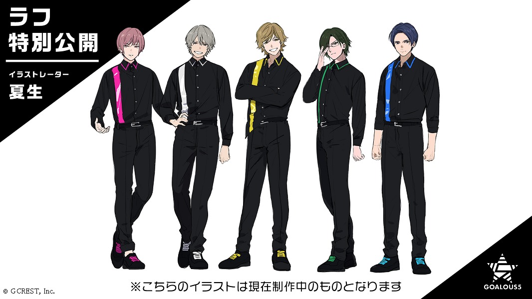 GOALOUS5が2次元キャラクターとなる新プロジェクトが始動、ラフイラストが公開された。キャラクターデザインは、TVアニメ『BAKUMATSU』や女性向け『DREAM!ing』、ツキノ芸能プロダクション『VAZZROCK』などのキャラクター原案を担当した夏生氏が担当。WEB番組『5チャンネル』の2020年7月15日(水)の配信回では、5人がキャラクターの設定について考える模様が配信される。