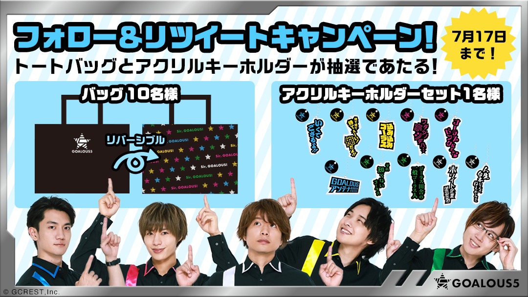 初のオフラインイベント「声福大作戦~集結!GOALOUS5!~」で発売された「GO5チャンネル」で生まれた名言を集めたアクリルキーホルダー「ゴーラスワード第2弾」や、シンプルデザインの表とメンバーカラーデザインの裏とリバーシブルで使用できる「ゴーラスメタモルフォーゼバッグ(リバーシブルトートバッグ)」が新たに発売決定。