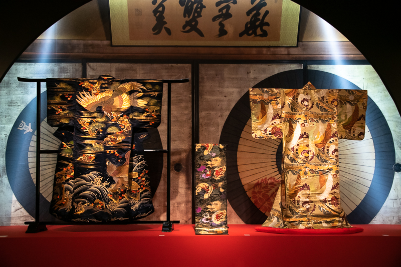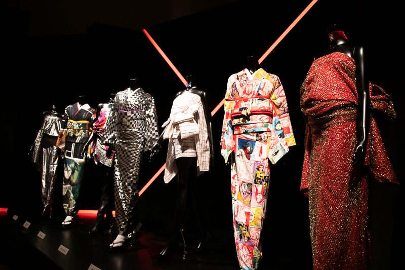 本展覧会を締めくくるのは、X JAPANのリーダーYOSHIKIによる「YOSHIKIMONO」だ。呉服屋の長男として生まれ育ったYOSHIKIは、素材の選び方や履物にブーツを合わせる試みなど、ここまでの展示作品のいずれとも異なる美意識とオリジナリティを発揮していた。