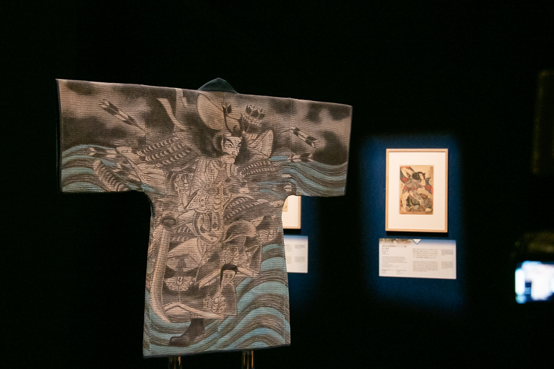 江戸っ子の「いき」を感じさせるのは《火消半纏》。国芳の武者絵さながらの刺繍が施されているのは、なんと裏側。火事が起こると火消は半纏の上から水をかぶり現場に駆け付け、無事に仕事が終わると半纏を表裏ひっくりかえし、美意識の詰まった裏地の絵を見せながら帰ったのだそう。