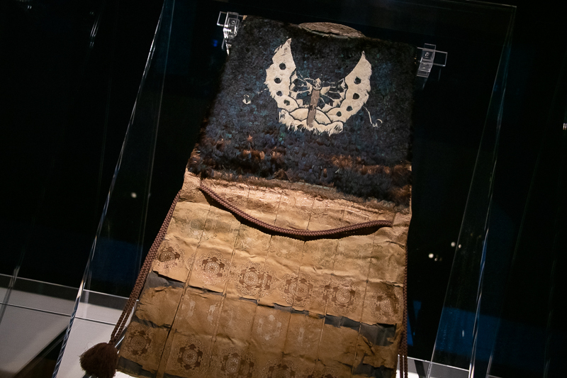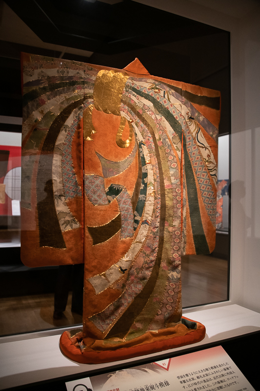 さて、ここまで女性のきものを中心に紹介してきたが、第三章では「男の美学」が取り上げられる。まず目に飛び込むのは3領の衣装で、それぞれ織田信長、豊臣秀吉、徳川家康に縁のあるものだ。中でもインパクトがあるのが「信長から拝領した」と溝内家に伝わる陣羽織である。