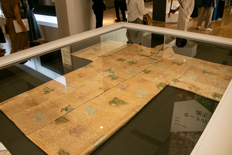 書画や彫刻などの美術品と違い、きものは着て使うものだ。そのため、良い状態で保存されている数が少ないのだそう。本展覧会では、貴重な鎌倉時代や室町時代のきものが出品されている。《表着 白地小葵鳳凰模様二陪織物》は、国宝指定されている鎌倉時代の宮廷装束だ。後白河法皇が祭神の一柱である神功皇后に奉納したものと伝えられ、全体には三色の鳳凰があしらわれている。