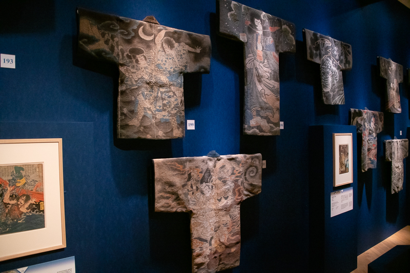 特別展『きもの KIMONO』展示風景: 火消半纏がずらりと展示されている。