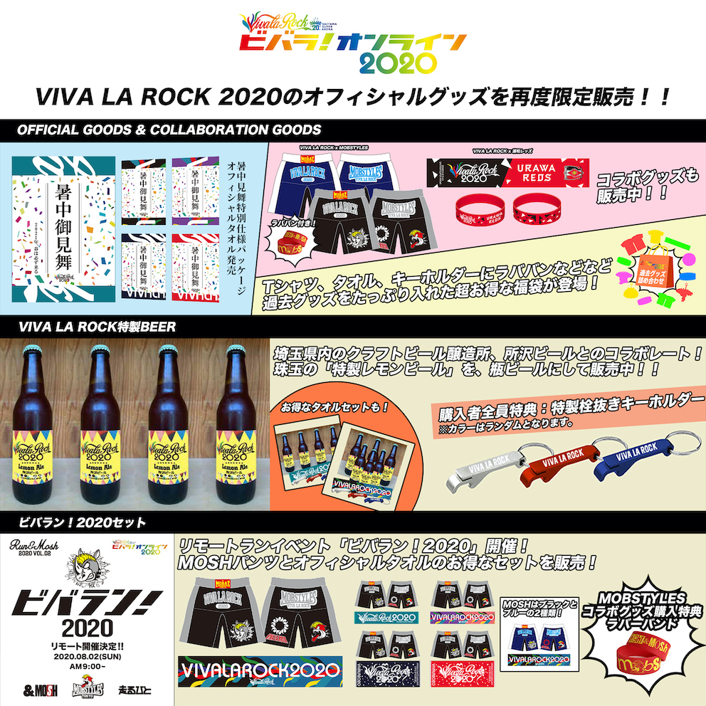 また、開催に向けて、公式サイトにて『VIVA LA ROCK 2020』のグッズの最終販売もスタート。「暑中見舞特別仕様パッケージ」のオフィシャルタオルや過去グッズ豪華詰め合わせ福袋などに加え、MOBSTYLESや浦和レッズとのコラボグッズ、そして埼玉県内のクラフトビール醸造所「所沢ビール」とのコラボレートによる特製レモンビール「VIVA LA ROCK 2020 Lemon Ale」も販売中。『VIVA LA ROCK 2020』のグッズが購入できる最後の機会となるので、是非チェックしよう。