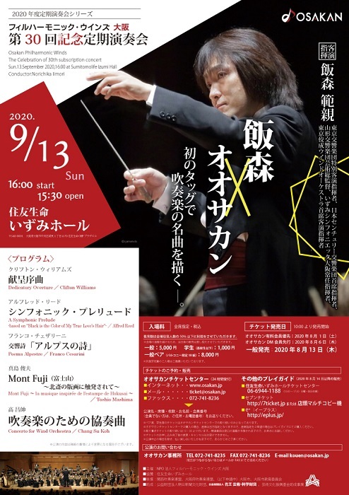 2020年9月13日(日)住友生命いずみホールにおいて、フィルハーモニック・ウインズ大阪(通称:オオサカン)第30回記念定期演奏会が開催される。フィルハーモニック・ウインズ大阪は、1999年に設立、2006年日本初のNPO法人のプロフェッショナル吹奏楽団となり、2011年に豊能町教育委員会と「教育・文化・芸術等の振興」に関する協定を結び、豊能町立ユーベルホールを本拠地として活動している。