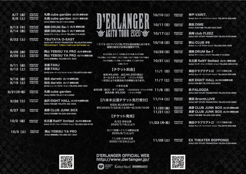 8月22日(土)に行われる『D’ERLANGER AGITO TOUR 2020』TSUTAYA O-EAST公演が、イープラス Streaming+にて生配信されることが決定した。