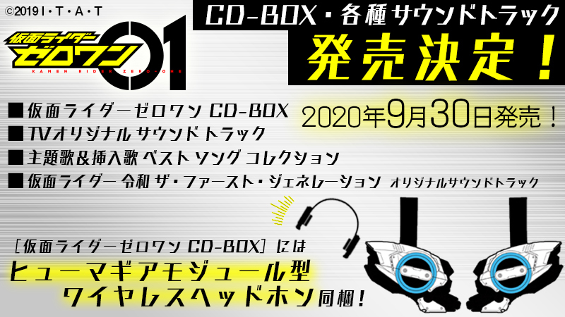 CD-BOXは、『仮面ライダーゼロワン』TV オリジナル サウンド トラック vol.1、『仮面ライダーゼロワン』TVオリジナル サウンド トラック vol.2、『仮面ライダーゼロワン』主題歌&挿入歌 ベスト ソング コレクション、『仮面ライダー 令和 ザ・ファースト・ジェネレーション』オリジナルサウンドトラックの4枚組で構成。さらに、劇中に登場する人工知能搭載人型ロボ=ヒューマギアの気分で音楽を聴ける“特製ヒューマギアモジュール型ワイヤレスヘッドホン”が付属する。ヘッドホンや収録内容の詳細は後日発表されるとのこと。