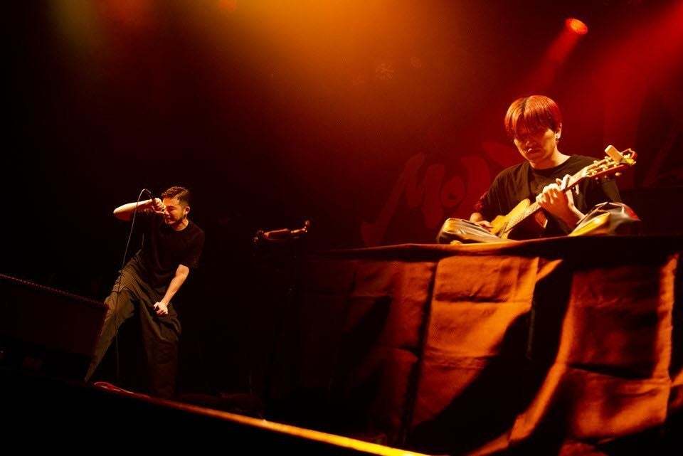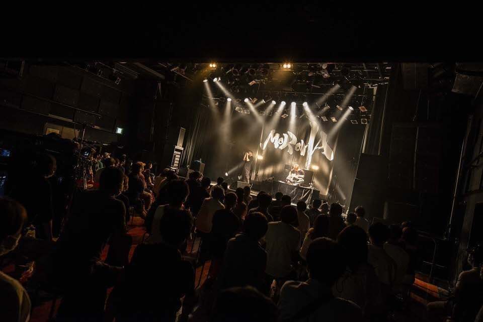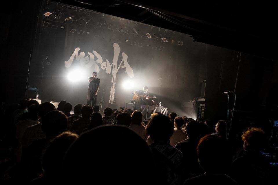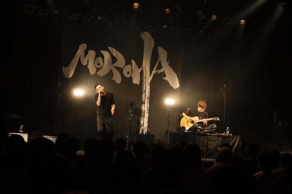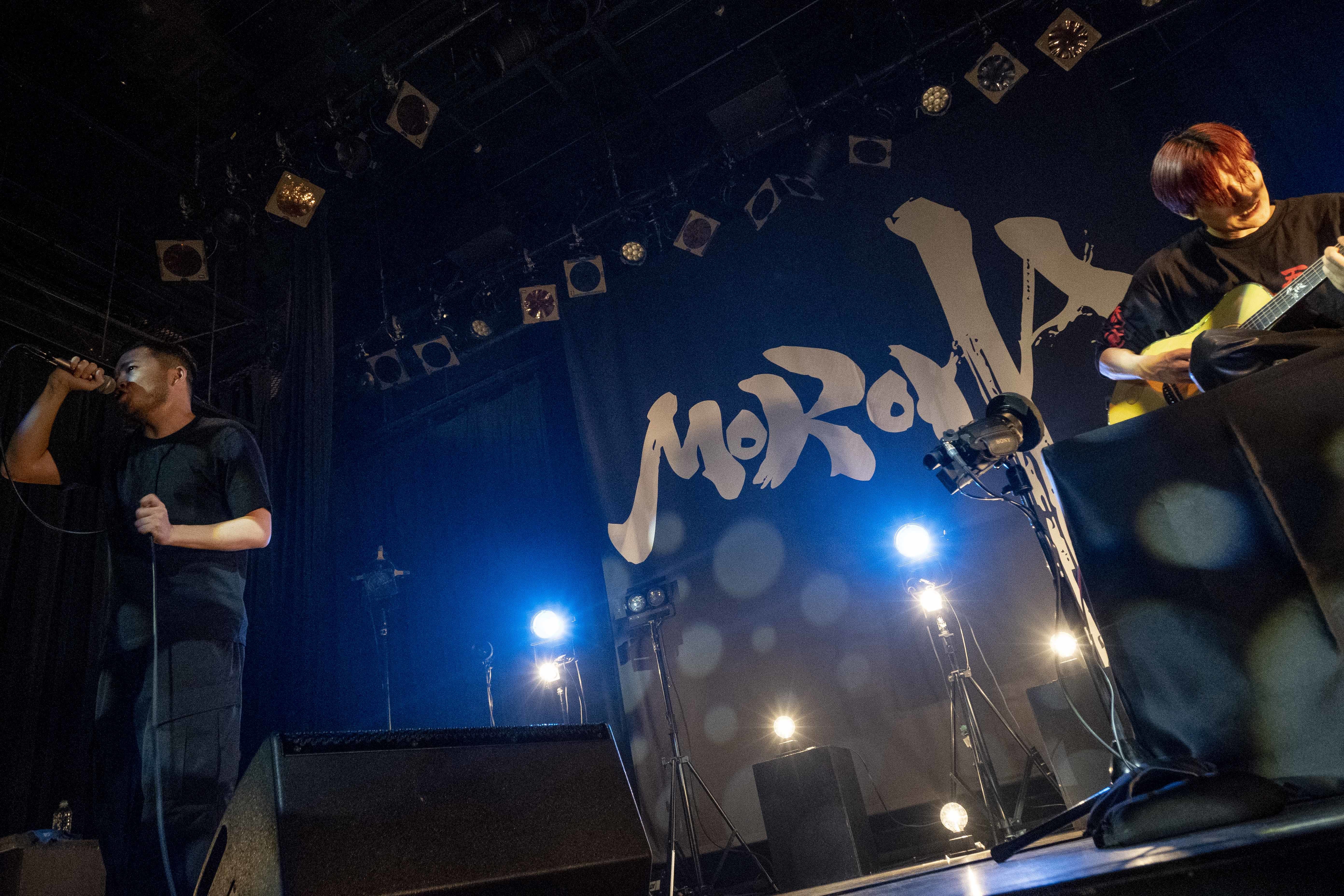 等間隔で置かれた座席に腰掛けているオーディエンス。とてもライブと呼べる空気でなくて、何かの説明会のようにすら思えた。正面のステージには、いつものMOROHAのバンドロゴ。これからパフォーマンスする二人だって、きっとこんな異様な空気で演奏すること、平気でいられるわけがないだろう。