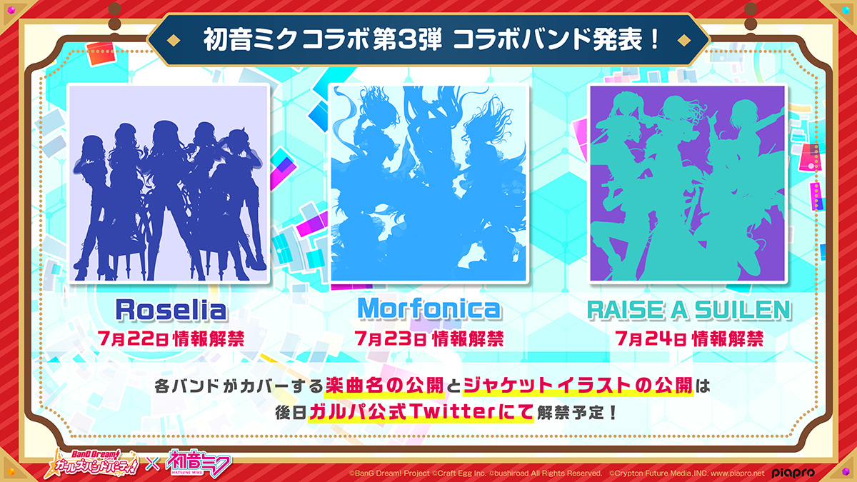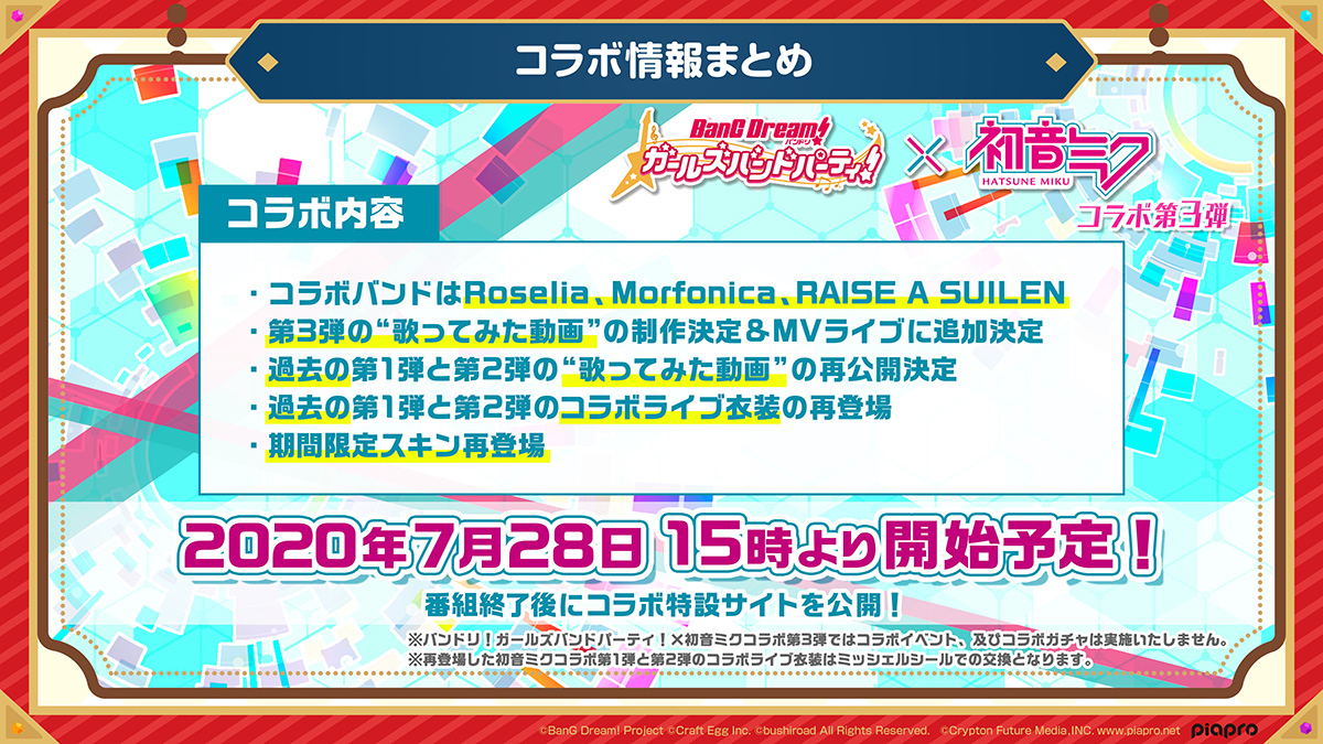スマートフォン向けゲームバンドリ! 『ガールズバンドパーティ!』は、7月19日(日)の公式生放送で、バーチャル・シンガー「初音ミク」とのコラボレーション企画第3弾を開催することを発表した。