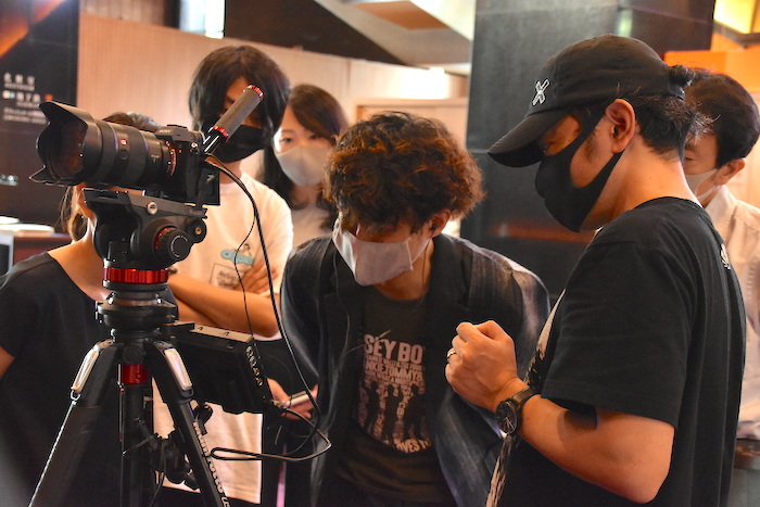 画面の確認をする藤田俊太郎(中央)。出演していないときはマスクをするなどして感染予防の対策を講じた。