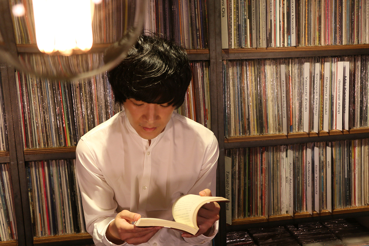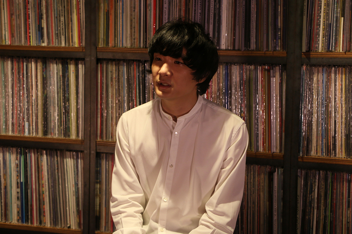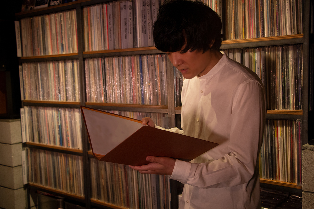 画面には石崎の姿が映る。レトロなエジソン電球のあたたかい光が満ちる部屋の中、背景には一面にレコードが並べられた木製の棚。