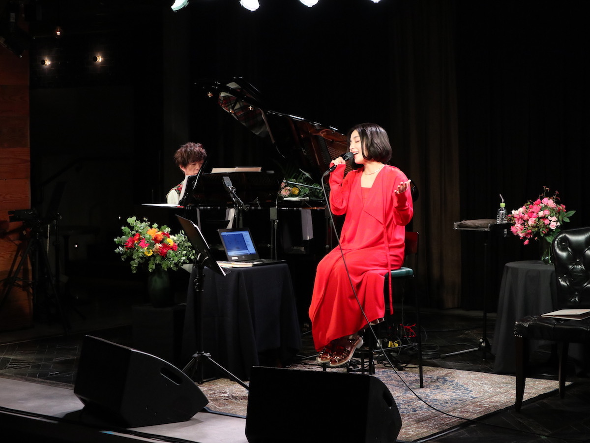 城にとっては、実に5か月ぶりとなるステージ。「初の配信ライブ、今日は松本俊明さんと一緒にお届けしたいと思います」と城が挨拶して、「一緒にライブができてうれしいですね」と2人が微笑み合えば、なんて温かな空気感。そして華道家の大久保有加が手がけたというWABARAやガーベラが飾られたステージはとても華やかだ。「いつか星になる」、ライブで初披露となった「タピオカ」は、松本が城のために書き下ろしたナンバー。儚さに思わず涙腺がゆるむ「いつか星になる」、タイトルに反してドキっとするほど陰りを帯びた、ライブ初披露となる「タピオカ」をしっとりと歌い上げる。楽曲によってがらりと異なる表情を見せ、豊かな表現をする2人に魅せられてしまう。