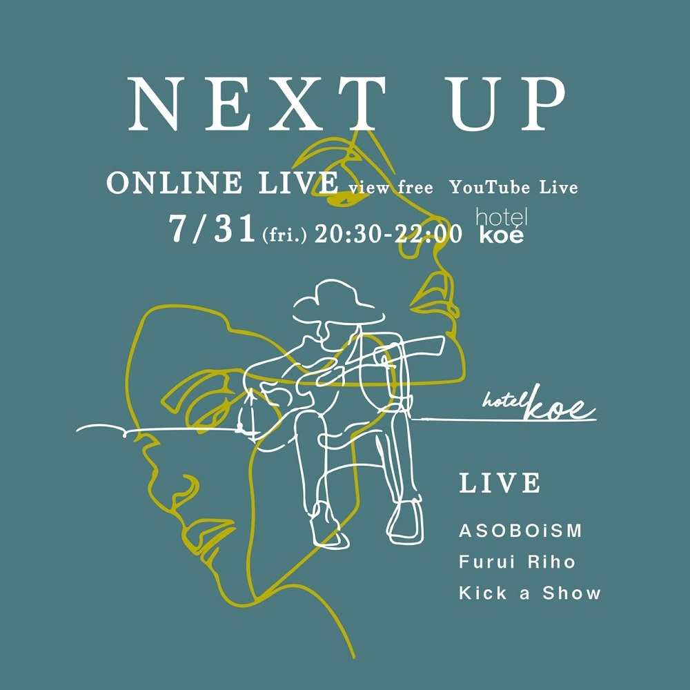 hotel koe tokyoが、新型コロナウィルスの感染拡大を受けて休止していたイベントを、7月31日(金)から再開する。その第1弾として、休止以前からのレギュラーイベント「NEXT UP」の無料オンライン配信が決定。ASOBOiSM、Furui Riho、Kick a Showが出演する。