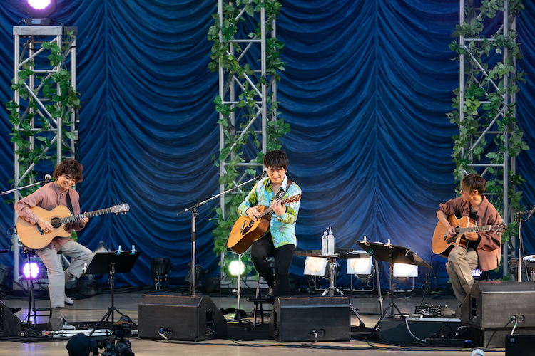 ジリジリと照り付ける日差しと蝉の声を背に、AKB48の「恋するフォーチュンクッキー」のカバーでは会場から沸き立つ手拍子に後押しされながら、3本のアコースティックギターが絶品サウンドを生み出し、その後は押尾単独のステージへ。