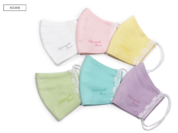 マスクは、“TAKARAZUKA REVUE”のワンポイントロゴと、レースをあしらった上品なデザインに、宝塚歌劇の5組をイメージした5色とホワイトの計6色をラインアップ。夏場でも通気性が良く快適な綿の平織素材を使用した上質な商品で、家庭で洗濯して繰り返し使用できるほか、裏面には抗菌加工が施されている。観劇の際はもちろん、日々の生活においても、宝塚歌劇の華やかな世界観が楽しめるマスクになっているそうだ。