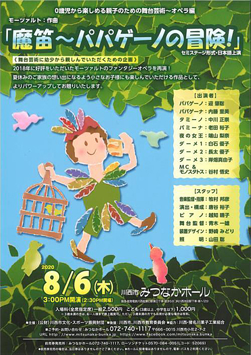 8月上旬、川西市みつなかホールで開催されるファミリー向けの歌劇「魔笛~パパゲーノの冒険!」に、神戸市混声合唱団のコンサートミストレス内藤里美とソプラノ・パートリーダー端山梨奈、そして合唱団OGにして前ソプラノ・パートリーダー老田裕子が主要な役で出演するという情報を入手。