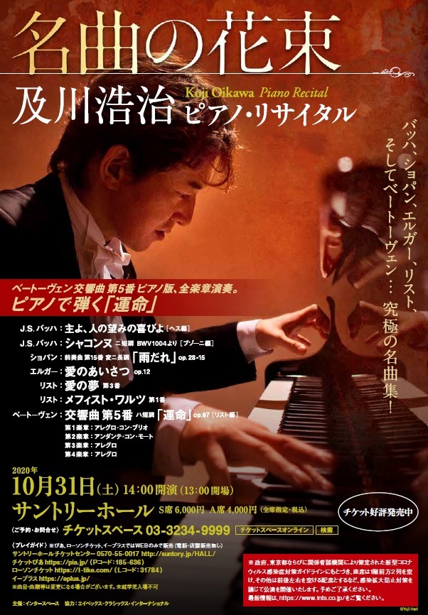 2020年10月31日(土)サントリーホールにて及川浩治ピアノ・リサイタル『名曲の花束』が開催されることが決定した。