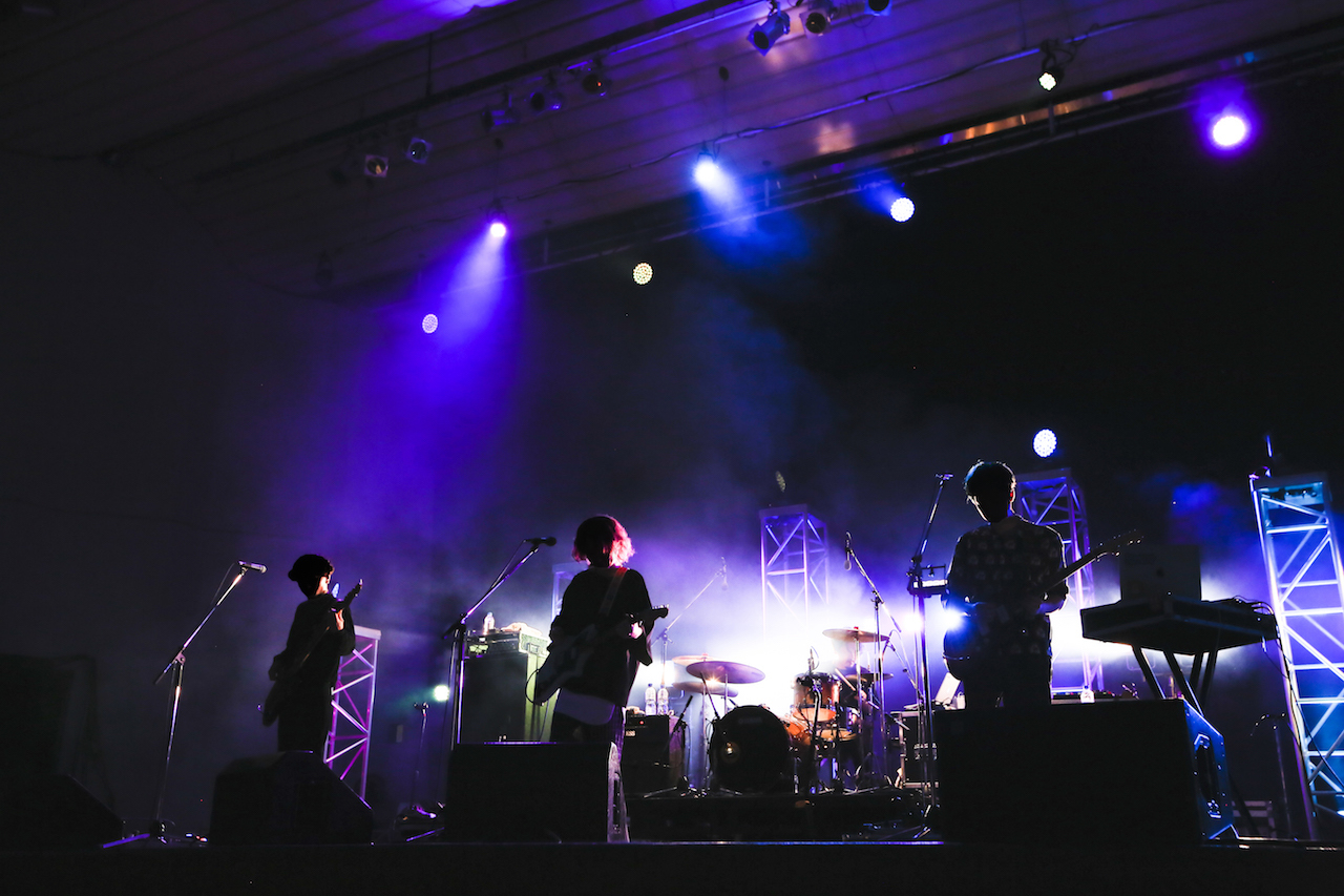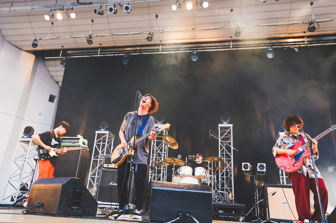 the shes goneにとってもこれが約5ヶ月ぶりのライブ。「天気も暑くて、気持ちも熱い」とDaishi(Ba)。この日楽器の一つかのように鳴り響いていた蝉の鳴き声にも触れながら最後まで一緒に楽しみたいと4曲目「想いあい」へ。待っていましたと客席からは歓声がじわりと広がる。淡いムラサキ色の照明を背景にみずみずしいギターと熱っぽいメロディを噛み締め「ふたりのうた」へ。「自分のことだけ考えるのではなく、性別や年齢、肌の色瞳の色が違っても誰かを想う気持ちを込めた」と兼丸がいうように、<あなたにとって、私にとって、大切なものって何だろう>とその歌詞たちは優しく私たちに問いかける。だんだんと盛り上がりを見せるドラムの音は彼ら自身の心の成長も表しているんだろう。大きな拍手が会場に響くと、最後のMCへ。
