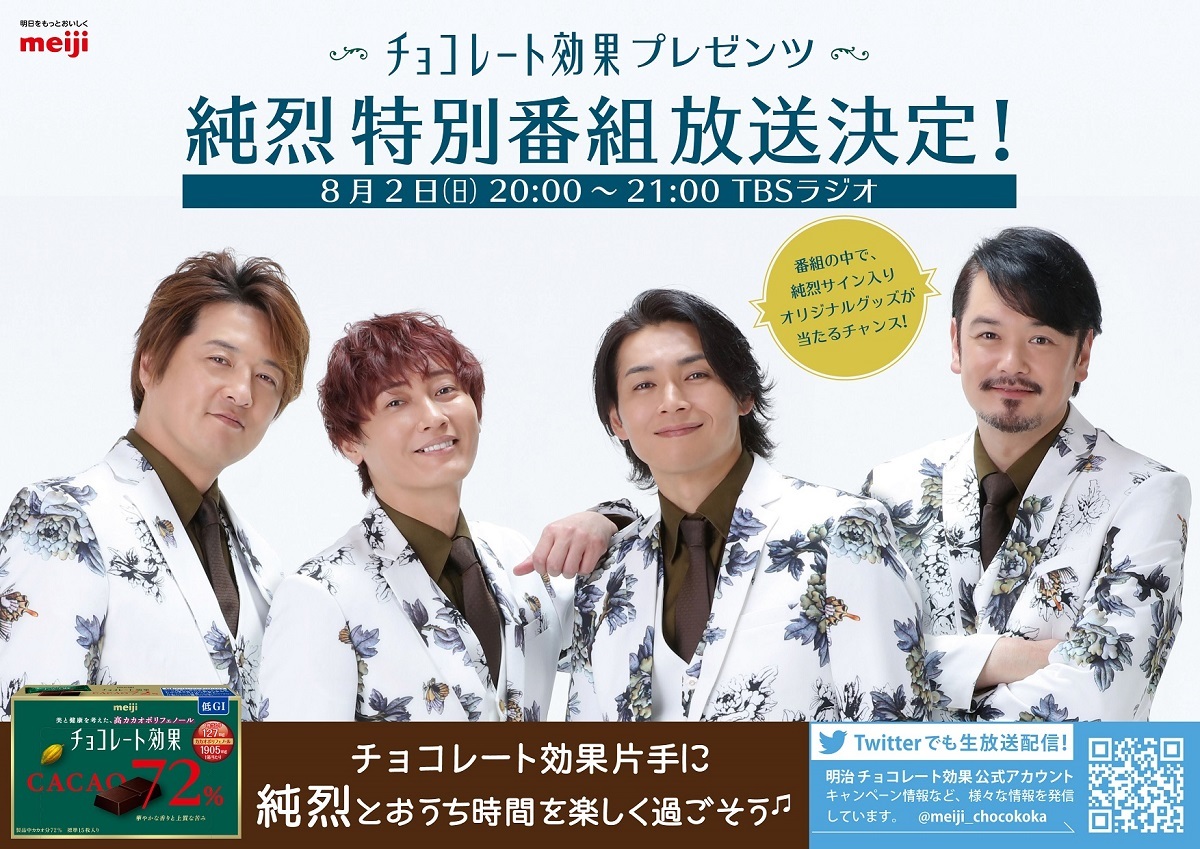 純烈のラジオ特別番組『明治 チョコレート効果 presents 純烈と、おうち時間』が、8月2日(日)20:00~20:55にTBSラジオで放送されることが決定した。