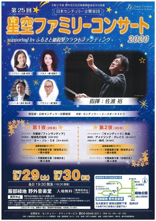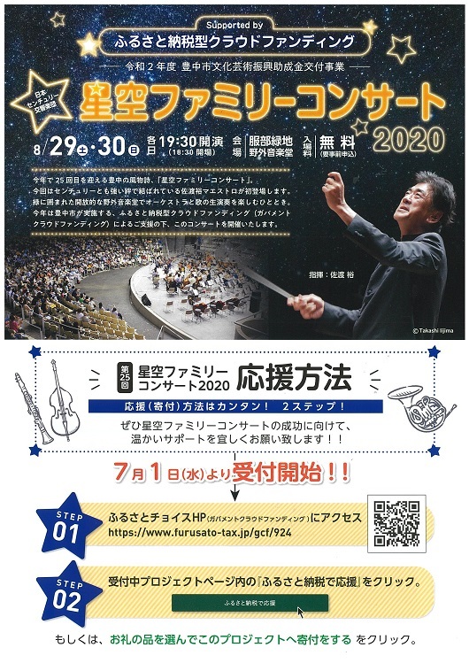 このコンサートをこれまで無料でやり続けて来たのは何とも太っ腹なことだが、今年はこの豊中の夏の風物詩「星空ファミリーコンサート」を、地元の豊中市が実施する「ふるさと納税型クラウドファンディング(ガバメントクラウドファンディング)」による支援の下、開催するそうで、一般の方からも広く支援を呼び掛けているそうだ。