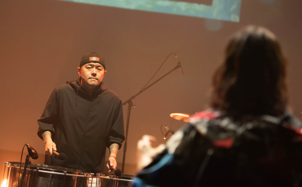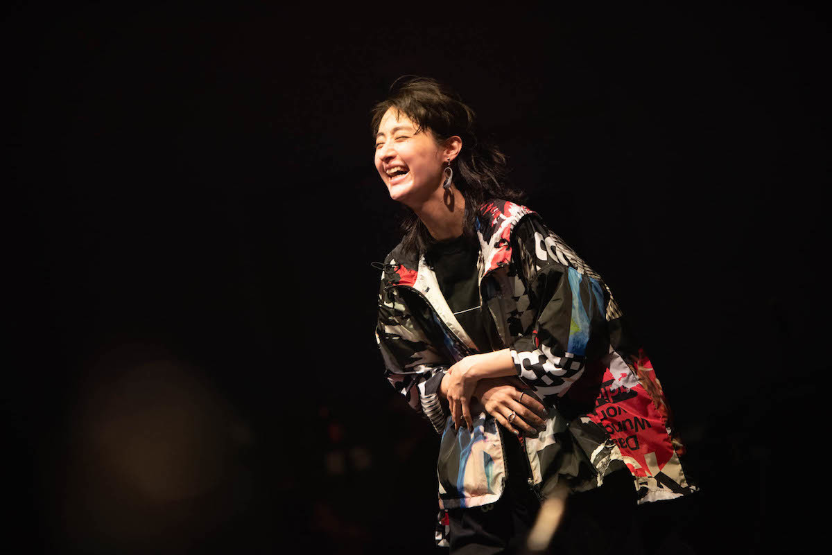 後半にかけては、背景のスクリーンに映像が映し出されていたが、もともと完成形が決まっていない音楽に乗せるわけだから、映像もおそらくVJが演奏に反応しながら即興で流しているのだろう。このあたりからはパーカッションだけでなくドラムセットの演奏も交えたりと(各人が入れ替わりながら担当)、より開放的でラウドな瞬間が続き、一気にラストまで走りきる。手応えからだろうか、シシド・カフカにもパーカッショニスト陣にも笑顔が増えていた。