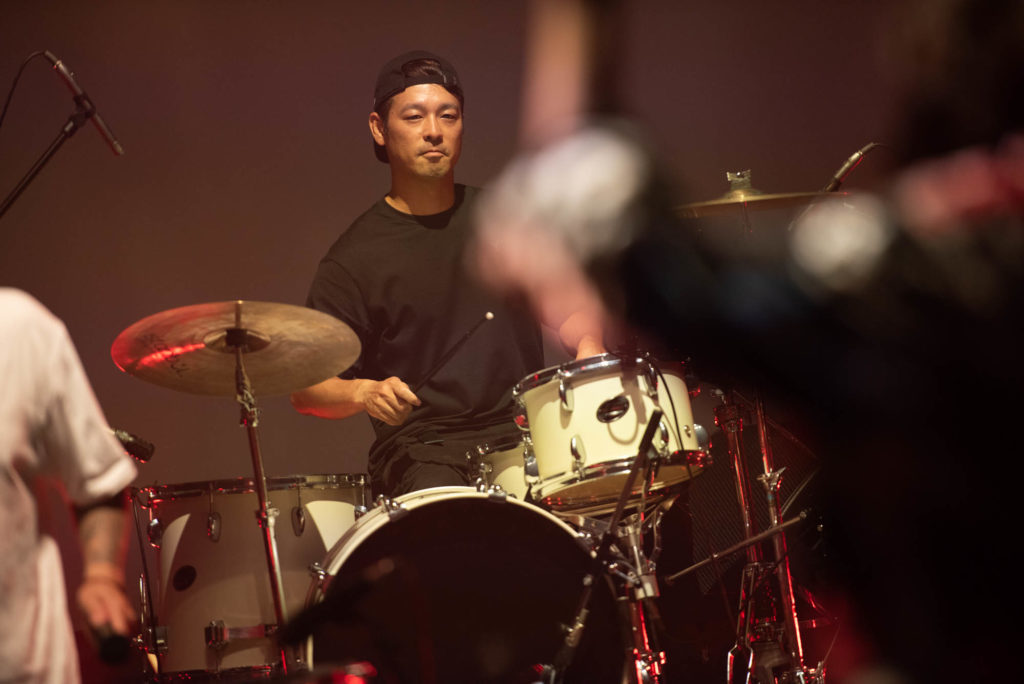 光量を抑えたステージ上に並ぶ様々な打楽器と、その奏者たち――IZPON、伊藤大地、岩原大輔(旅猫油団,小沼ようすけtrio)、浦山一悟(ACIDMAN)、KENTA(SPYAIR)、はたけやま裕、MASUO(BACK DROP BOMB, PONTIACS, J)、芳垣安洋(ROVO, Orquesta Libre, Orquesta Nudge! Nudge! etc.)。一歩下がった位置にベーシストとしてケイタイモ(WUJA BIN BIN etc.)がスタンバイ。彼らと向き合うように立つシシド・カフカの合図で演奏がスタートする。