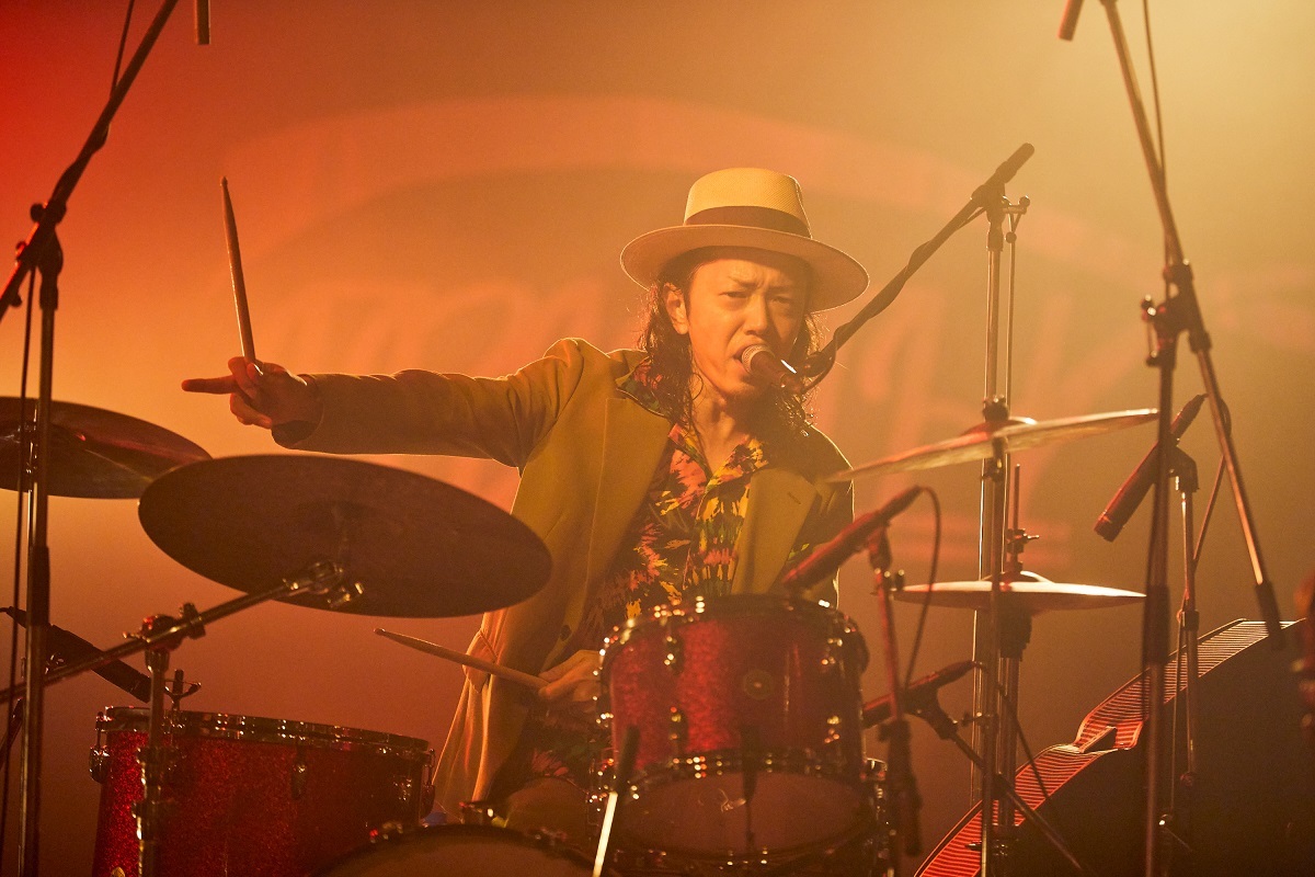 どんどん行こう。手拍子がよく似合うロックでジャズでファンクな「Hop」から、モンキーダンスがよく似合うスカでジャズでロカビリーな「Sand Castle」へ。織田と藤田が持ち場を離れて踊りまくるのを、レポーターのように追いかけるカメラ。手ブレも逆光も関係ねぇ、音の渦のど真ん中に飛び込むカメラワークがいかしてる。ライブで常に大合唱になる「ぶちかませ!」では、「おいおい全然聴こえねーよ!」と伊藤が煽る。やってることはいつものライブと変わらない、変えようがない。「チャット覗いてみましょうか。“YEAH! YEAH!”ばっか(笑)。すげぇ盛り上がってます」。歌い終えた伊藤がモニター画面を見ながら笑う。思いは確かに通じ合ってる。