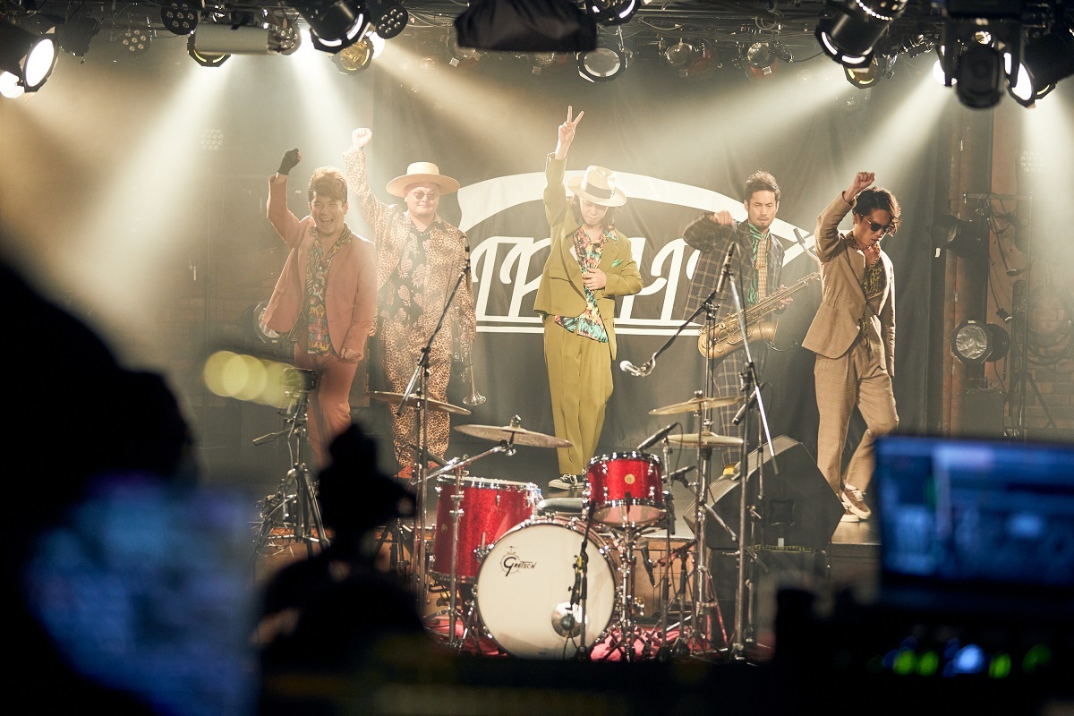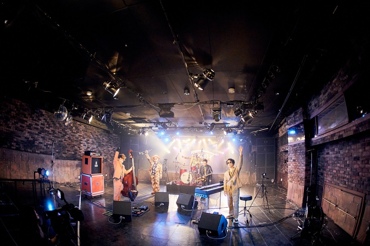 ライブハウスのフロアに楽器を据えた、通常はありえないセッティング。ドラムス伊藤隆郎がカメラに向かい高らかに名乗りを上げ、始まったのは「Maximum Shout」だ。“へイ、ホー、レッツゴー!”のコールが見せ場のこの曲、「画面の向こうで一緒に叫ぼうぜ!」と伊藤が煽る。2曲目「Stompin’ Boogie」では、「エブリバディ、クラップユアハンズ!」と叫ぶ。たとえ目の前には誰もいなくても、否、だからこそこの音と声を届けようという気迫がすごい。そして、ピアノ竹内大輔の猛烈速弾きピアノが炸裂すれば、負けじとサックス藤田淳之介が高速トリルで応戦し、5人の超絶ソロがリレーされる「Freeway」のかっこよさ。配信だからこそ表情や手元がクローズアップされる、生ライブにはない醍醐味も確かにある。