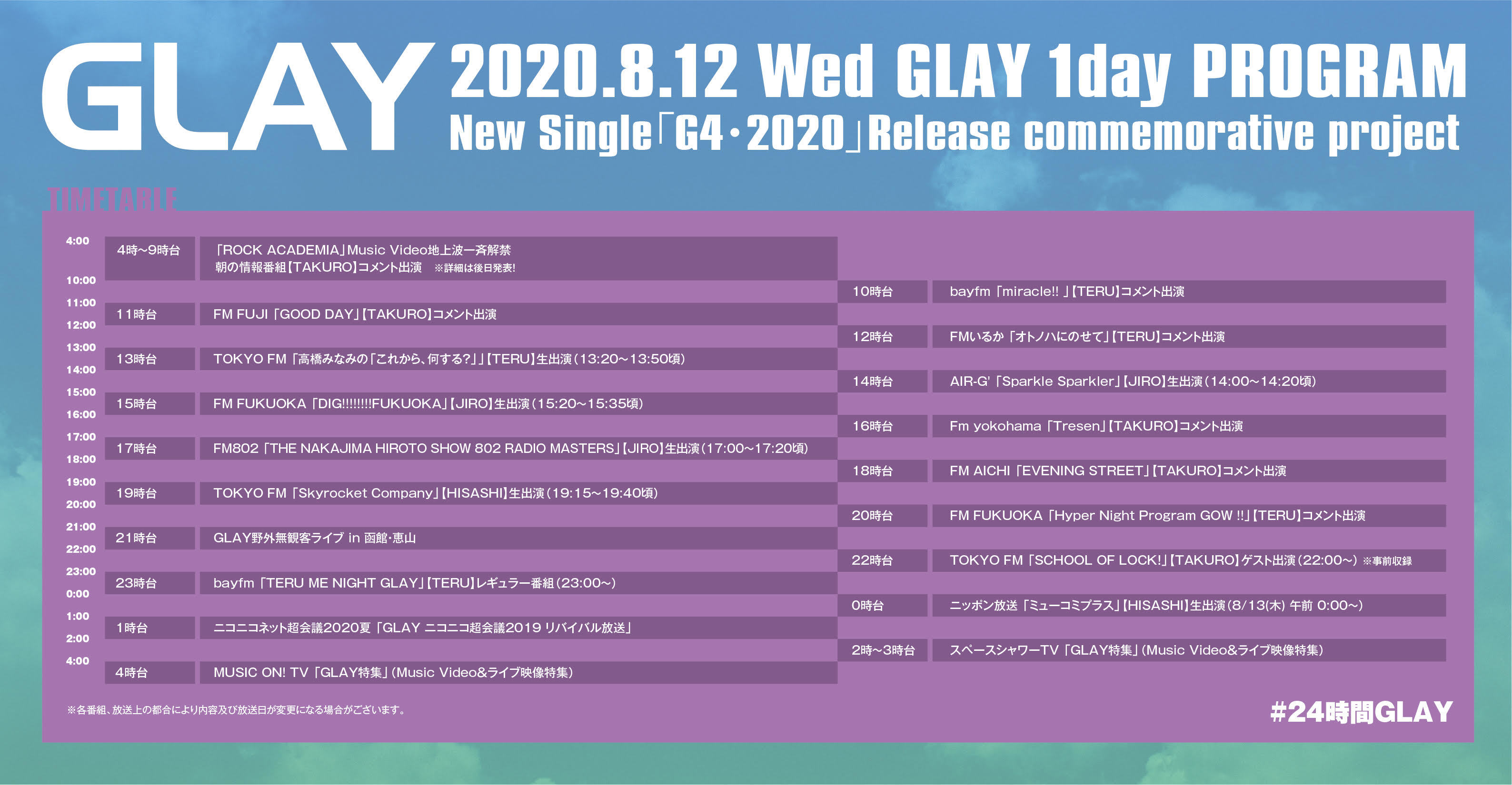 このプログラムは8月12日(水)から8月13日(木)にかけて、24時間GLAYが様々な媒体で多様なコンテンツを発信するプログラムとなっている。同時に発表されたタイムテーブルには、全国各地のラジオ番組へのメンバーの生出演やコメント出演、テレビ番組の映像出演から映像特集など様々な内容が記載されている。また、『オンライン・野外フリーライブ』の全貌もGLAY Official YouTubeチャンネルにてプレミア公開される。